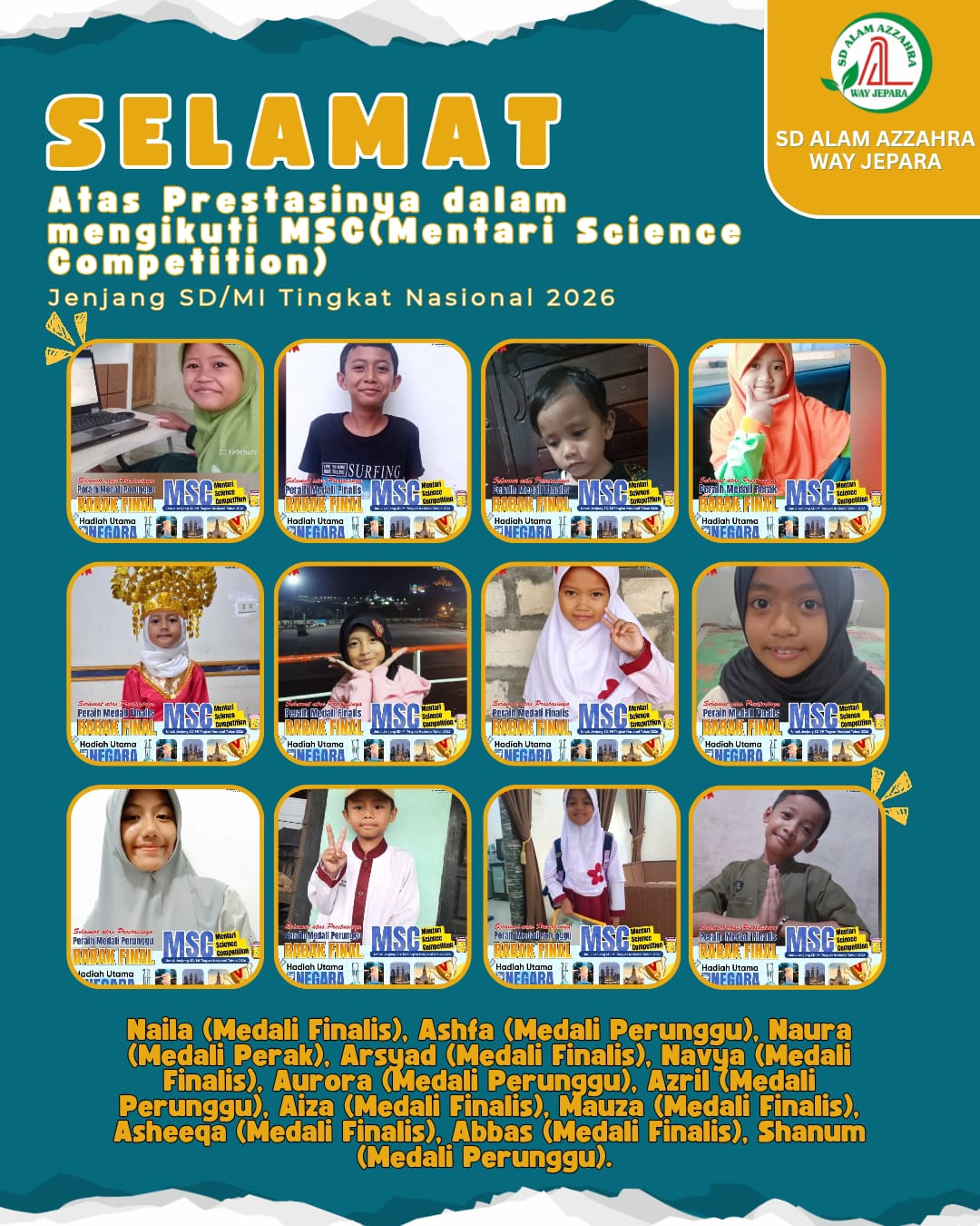 SD Alam Azzahra Way Jepara kembali menorehkan prestasi membanggakan dalam ajang MSC (Mentari Science Competition) Jenjang SD/MI Tingkat Nasional Tahun 2026. Kompetisi ini menjadi wadah bagi peserta didik untuk mengasah kemampuan akademik di bidang sains sekaligus menumbuhkan semangat berkompetisi secara sehat.